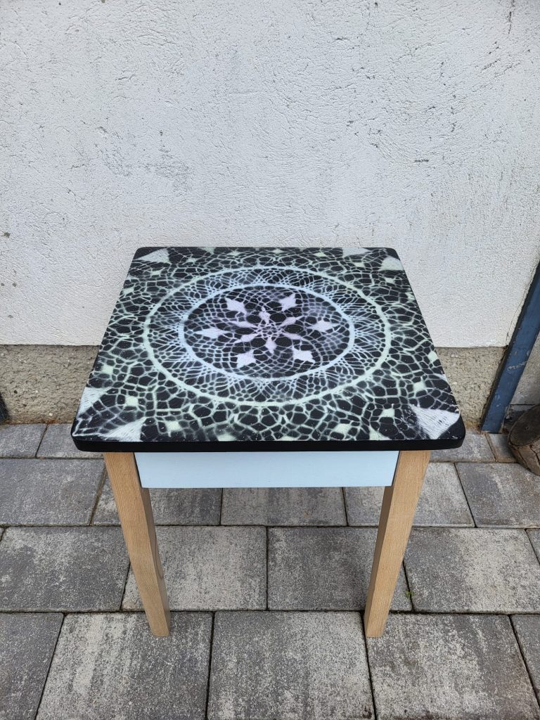 Zuerst habe ich die alte Oberfläche abgeschliffen, lose Teile ausgebessert und das Gestell stabilisiert. Dann kam der kreative Teil: Das Highlight des neuen Looks ist zweifellos die kunstvoll gestaltete Sitzfläche. Mithilfe eines Spitzendeckchens und Spraytechnik habe ich ein einzigartiges Mandala-Muster geschaffen – eine Kombination aus Struktur, Symmetrie und Kontrast. Der Effekt erinnert an ein Kaleidoskop aus Spitze und sorgt für einen echten Hingucker.