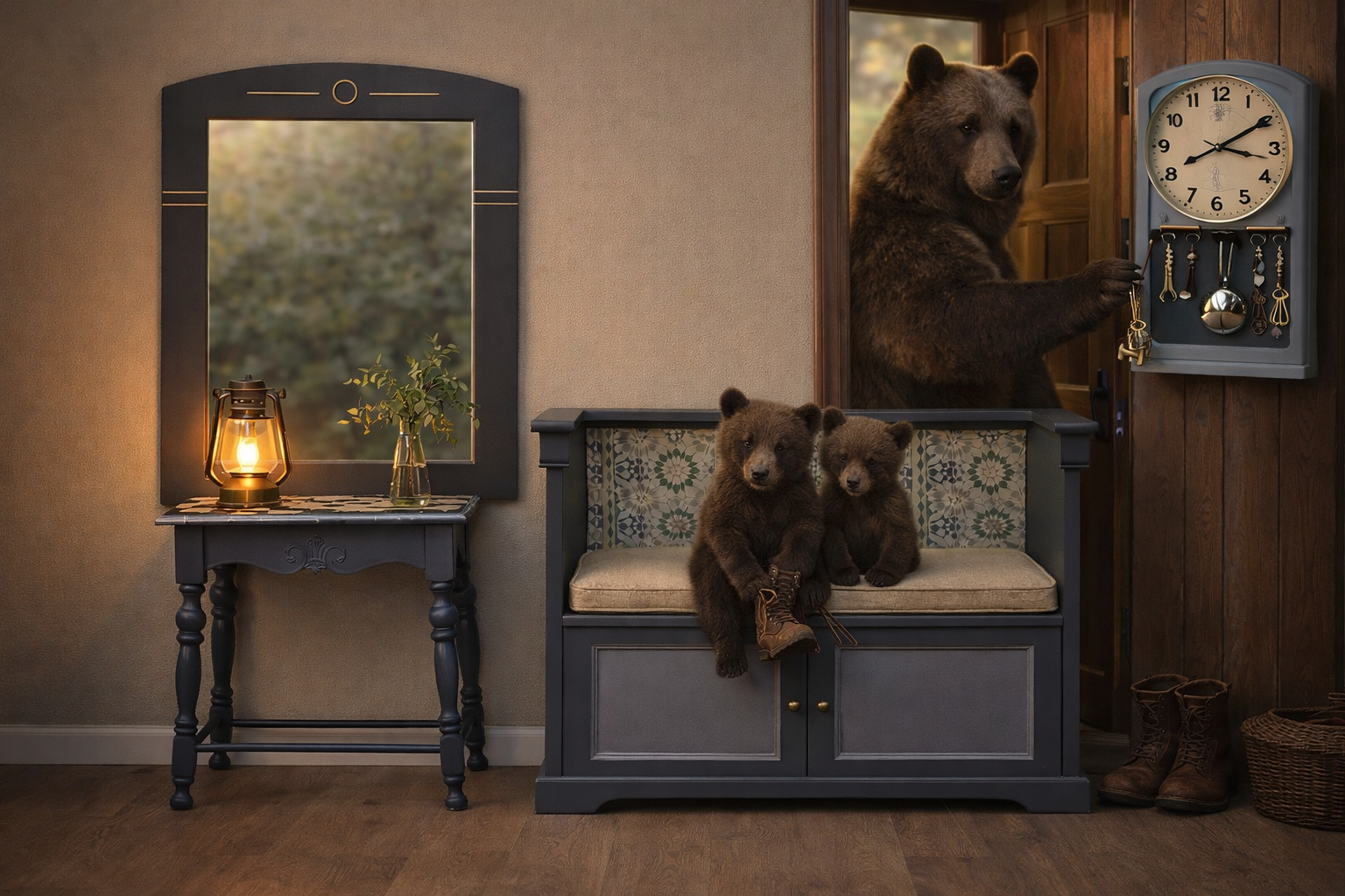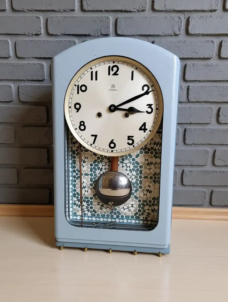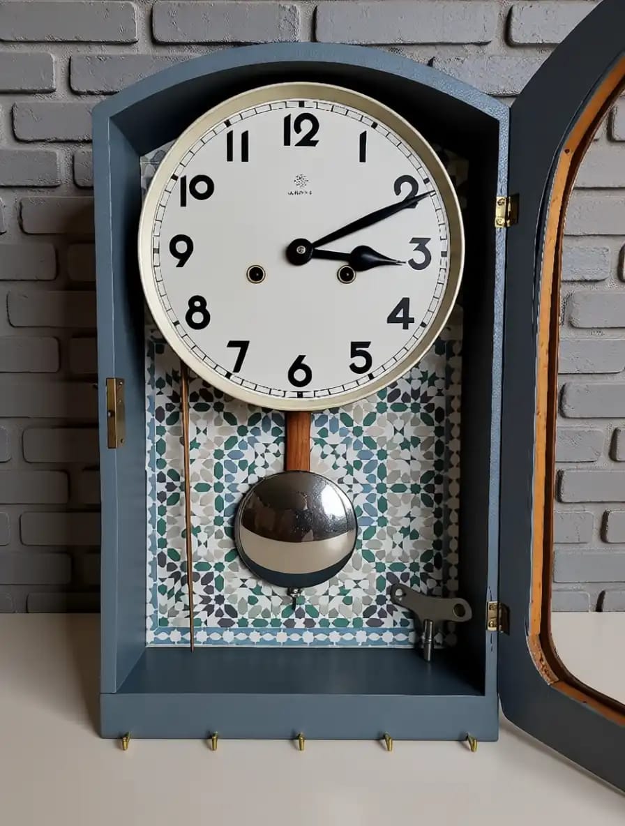 Die Pendeluhr funktioniert technisch einwandfrei und wurde an der unteren Kante mit stabilen Haken ergänzt. So dient sie nicht nur als Uhr, sondern auch als praktischer Schlüsselkasten, der Funktion und Gestaltung auf besondere Weise verbindet.