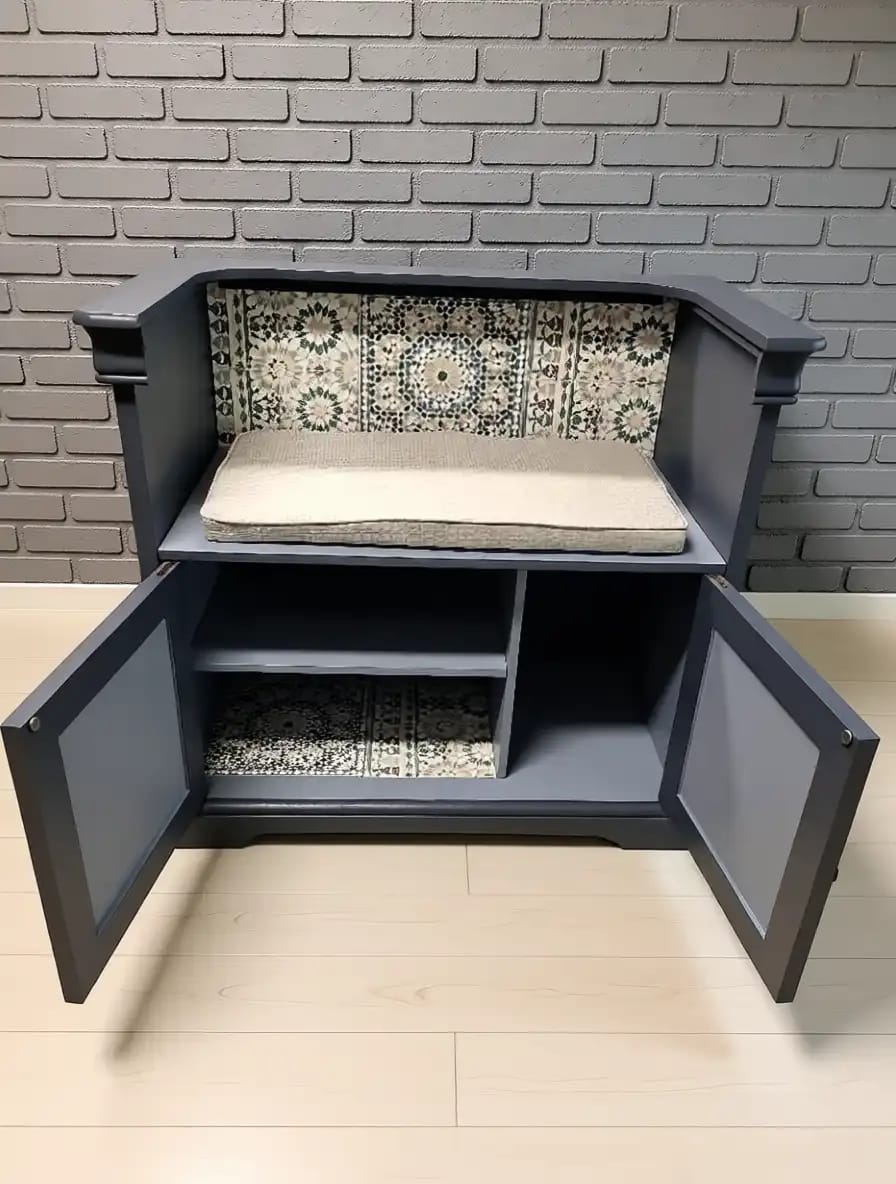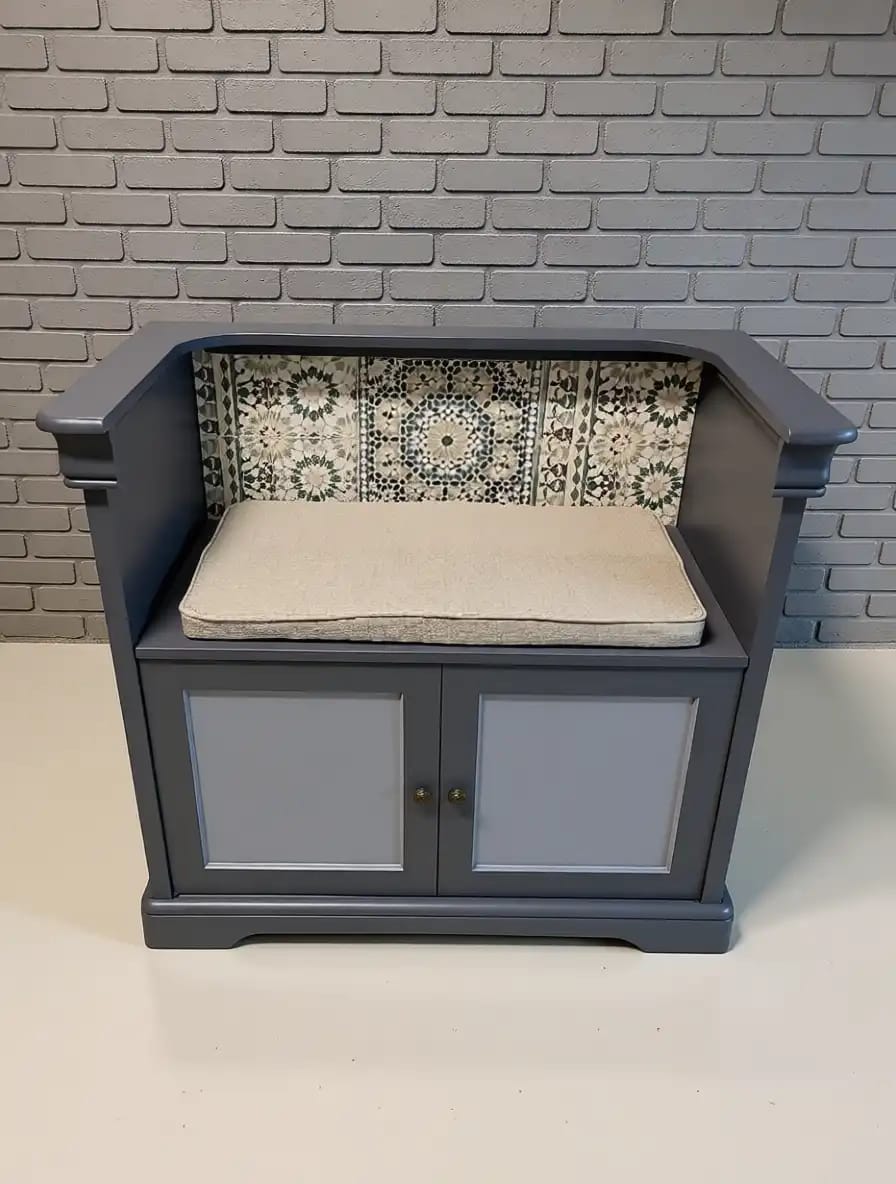 Die Sitzbank bietet hinter den Türen Stauraum für Schuhe, Taschen oder andere Alltagsgegenstände. Gleichzeitig lädt sie zum kurzen Verweilen ein und unterstützt einen aufgeräumten, strukturierten Eingangsbereich.