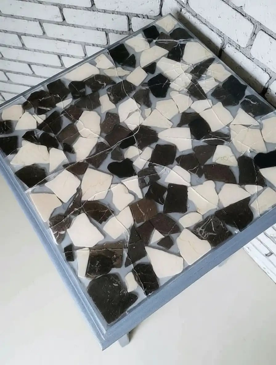 Der Tisch überzeugt durch eine gegossene Epoxidharz-Tischplatte mit gezielt eingesetzten Rissen und Sprüngen. Diese sind gewollt und Teil des Designs. Die Oberfläche ist vollständig glatt und versiegelt, wodurch eine angenehme Haptik und eine pflegeleichte Nutzung entstehen.