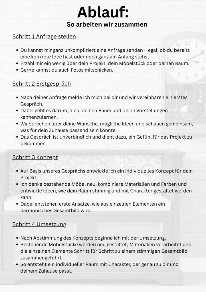 Durch sorgfältige Aufarbeitung, neue Materialien und ein stimmiges Farb- und Gestaltungskonzept entstehen aus alten Möbeln individuelle Unikate.